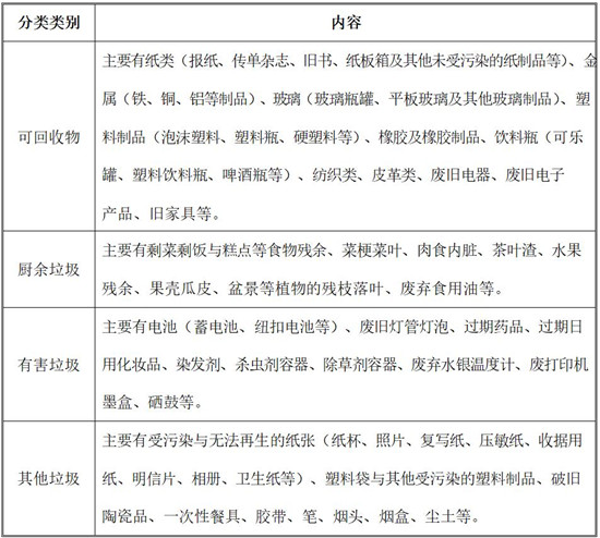 三、垃圾分類標(biāo)準(zhǔn):可回收物、廚余垃圾、有害垃圾、其 他垃圾,具體分類見(jiàn)下表: