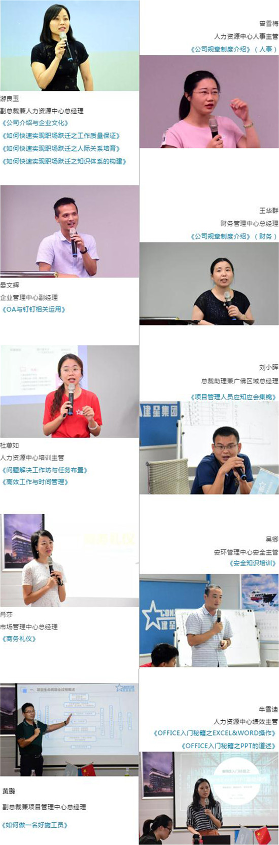 本次培訓(xùn)邀請(qǐng)到了強(qiáng)大的內(nèi)訓(xùn)講師團(tuán),他們或親切睿智、或幽默風(fēng)趣、或嚴(yán)謹(jǐn)細(xì)膩。講師們結(jié)合自己的職場(chǎng)經(jīng)驗(yàn),為星青年們傳遞建星企業(yè)文化、分享在建星成長(zhǎng)路上的所思所想,讓星青年們迅速地了解建星、融入建星、愛(ài)上建星。