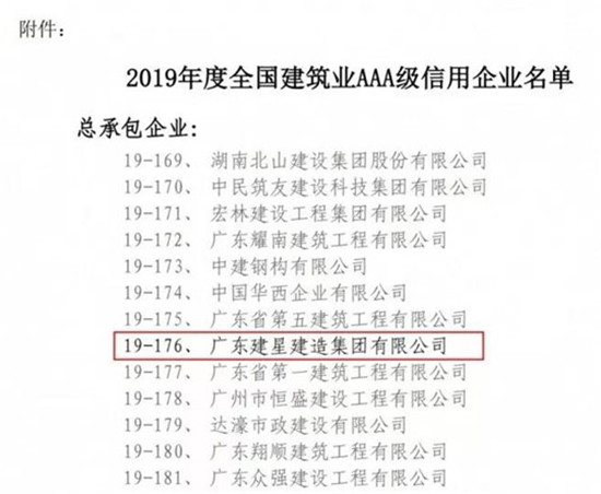近日,由中國(guó)建筑業(yè)協(xié)會(huì)組織的“2019年度全國(guó)建筑業(yè)AAA級(jí)信用企業(yè)”評(píng)選結(jié)果正式公布,建星集團(tuán)等215家總承包企業(yè)上榜。這是公司繼2014年度以來(lái)連續(xù)三次獲評(píng)該項(xiàng)榮譽(yù)。