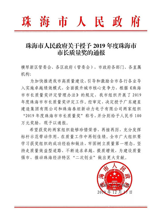 喜訊|繼省政府質(zhì)量獎后,建星集團(tuán)再攬珠海市長質(zhì)量獎
