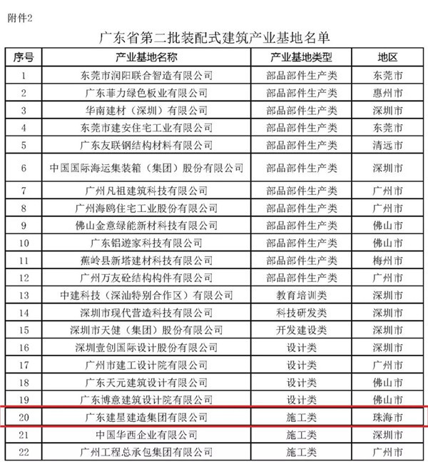 近期,廣東省住房和城鄉(xiāng)建設(shè)廳開展了廣東省第二批裝配式建筑示范城市、產(chǎn)業(yè)基地和示范項(xiàng)目的申報(bào)工作。經(jīng)專家評審,建星集團(tuán)成為珠海市唯一一個(gè)獲得裝配式建筑產(chǎn)業(yè)基地項(xiàng)目的施工單位。